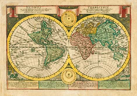"Globus Terrestris" Weltkarte in Mercator-Projektion,aus dem 'Atlas Selectus'. Altkol. Kst., Leipzig 1749, 16,7 x 24,5 cm.