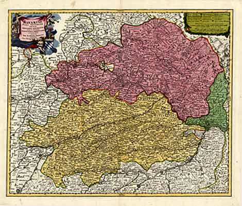 "Bavariae pars inferior" Dekorative Karte von Niederbayern und der Oberpfalz. Altkol. Kst. vonJ.B. Homann, Nürnberg ca. 1719-31, 48,5 x 57,5 cm. Tadellose Erhaltung und schönes, altes Flächenkolorit.