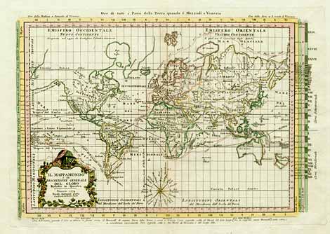 "Il Mappamondo..." Weltkarte mit Angabe von Zeitzonen, bezogen auf Venedig. Altkol. Kst., Venedig 1774(d), 29,4 x 40,5 cm.