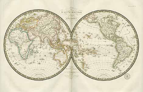 "Mappa-Monde en deux Hémisphères" Weltkarte in zwei Hemisphären, aus dem 'Atlas Universel', mit dem Trockenstempel des Verlages. Altes Grenzkolorit. Kst., Paris 1820(d), 38 x 57 cm.