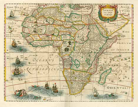 "Africae nova Tabula" Karte von Gesamtafrika. Deutsche Ausgabe. Altkol. Kst., Amsterdam ca. 1620, 37,6 x 49,8 cm. Breitrandiges Exemplar in einem prachtvollen Altkolorit, Papier leicht fleckig.