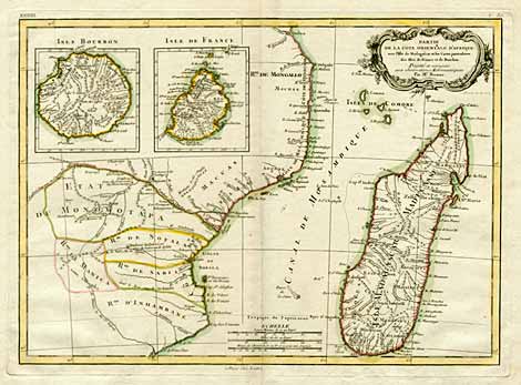 "Partie de la Cote Orientale d'Afrique..." Karte mit der Küste von Mosambik, der Insel Madagaskar und 2 Teilkarten der Inseln Reunion und Mauritius. Altkol. Kst., Paris ca. 1775, 30 x 41 cm.