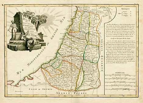 "Carte des douze tribes d'Jsrael par M. Bonne..." Map of the Holy Land,from 'Atlas moderne' published by Delalain and Lattré. Orig. col. copper engr., Paris c1770, 31,5 x 45 cm.