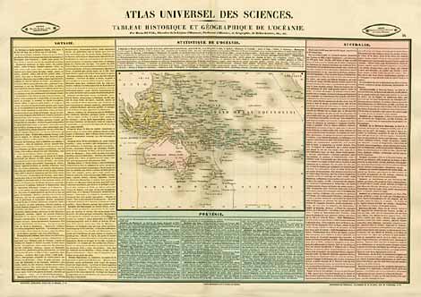 "Tableau Historique et Géographique de l'Océanic" Map of Australia and Oceania with historical and geographical descriptions. From 'Atlas univ. des science'. Orig. col. copper engr., Paris c1840, 39 x 58 cm.