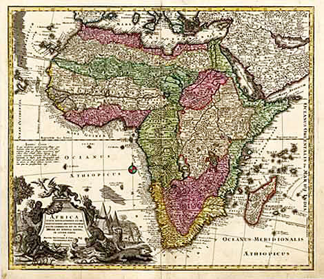 "Africa iuxta navigationes et ..." Karte von Gesamtafrika. Altkol. Kst., Augsburg ca. 1730/40, 49,8 x 57 cm. Schöner, kräftiger Druck.