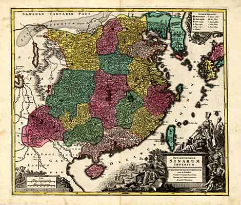 "Opulentissimum Sinarum Imperium..." Karte von China, mit einer großen, dekorativen Kartusche. Altkol. Kst., Augsburg ca. 1756/60, 50 x 56,5 cm. Schöner, kräftiger Druck, altes Flächenkolorit, sehr gute Erhaltung.