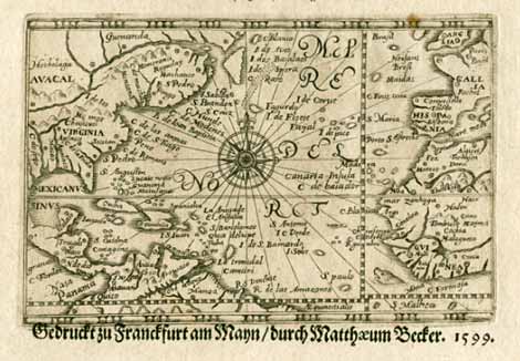 "Americae Achter Theil" Titelblatt der Großen Reise, Achter Teil, mit einer Karte des Atlantischen Ozeans, Buchblatt. Kst., Frankfurt am Main 1599(d), 9,5 x 14,2 cm. Burden 130 Sehr guter Druck und Erhaltung.