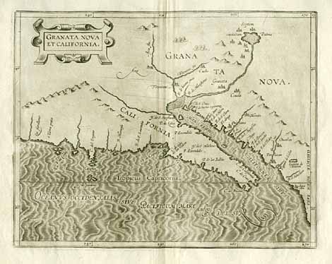 Karte von Kalifornien und der kalifornischen Hakbinsel. Erste gedruckte Detailkarte dieses Gebietes, aus dem ersten Atlas, der nur Amerika behandelt, 'Descriptio Ptolemaicae Augmentum'.