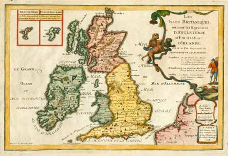 "Les Isles Britaniques..." Karte von Großbritannien mit Teilkarten den Färöer- und Shetland-Inseln. Aus dem 'Atlas Curieux'. Kol. Kst., Paris 1705(d), 23 x 34 cm.