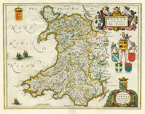 Karte von Wales, mit dekorativen Kartuschen und Wappen, aus 'Theatrum