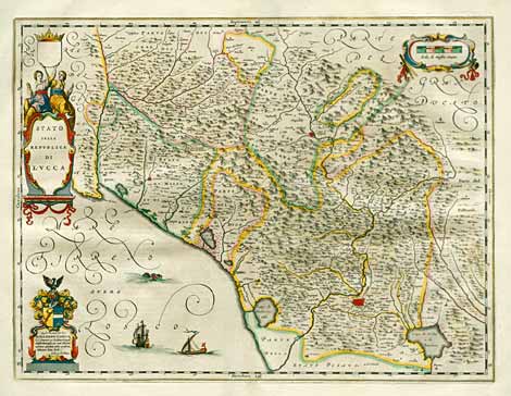 "Stato della Republica di Lucca" Map of the province of Lucca. German edition. Orig. col. copper engr., Amsterdam c1635/50, 39 x 50 cm. Perfect condition, broad margins and a very nice original colouring.