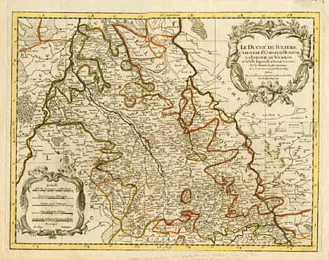 "Le Duché de Iuliers..." Karte des Herzogtums Jülich, Gebiet zwischen Ruremond - Düsseldorf - Bonn - Aachen. Altes Grenzkolorit. Kst., Paris 1692, 43,5 x 57 cm.