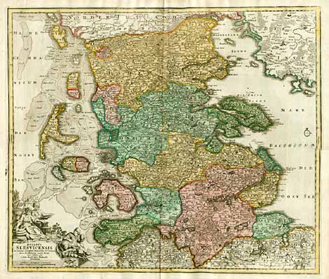 "Ducatus Slesvicensis in omnes eiusdem Generales Particulares Praefecturas exacte divisa" Karte des Herzogtums Schleswig, 1. Zustand ohne Privileg, schönes altes Flächenkolorit. Kst., Nürnberg 1712, 49 x 57,5 cm.