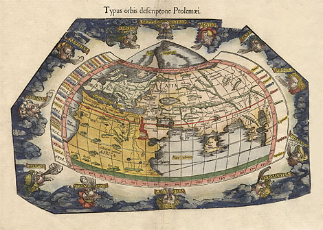 Dekorative Karte der Alten Welt umgeben von Wolken und den 12 Winden.
