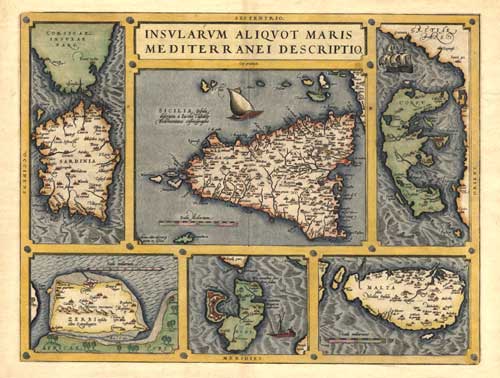 6 Inselkarten auf einem Blatt: Sardinien, Sizilien, Korfu, Jerba, Elba, Malta.