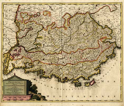 "Provincia. Supremarum Galliae praefecturarum una .."Map of the Provence. Orig. col. copper engraving, Amsterdam c1700, 50 x 60 cm.