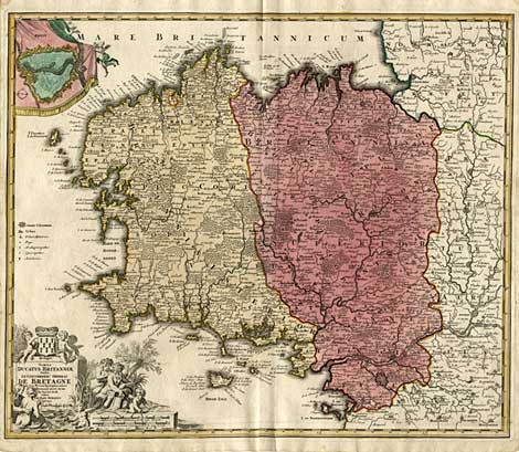 "Tabula Ducatus Britanniae Gallis le Gouvernem. General de Bretagne ..."Karte der Bretagne mit einem Stadtplan von Brest. Altkol. Kst., Nürnberg ca. 1720,49 x 58 cm.