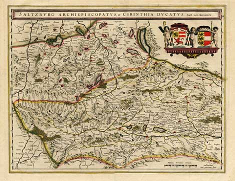 "Saltzburg Archiepiscopatus et Carinthia Ducatus"Karte mit dem Erzbistum Salzburg und dem Herzogtum Kärnten. Altkol. Kst., Amsterdam ca. 1630,38,5 x 50 cm.
