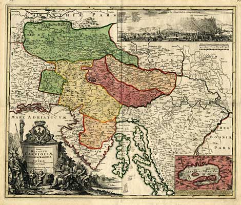 "Tabula Ducatus Carnioliae ..."Map of the area of today's Slovenia, with a view of Ljubljana (Laibach). Duchy of Carbniola, Istria. Orig. col. copper engraving, Nuremberg c1720, 49,5 x 58,5 cm.