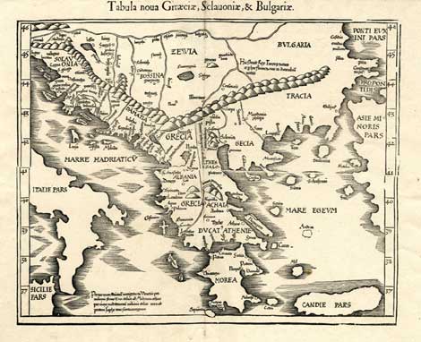 "Tabula nova Graeciae, Sclavoniae, & Bulgariae"Karte von Griechenland und Bulgarien. Holzschnitt, Vienne 1541,35 x 42 cm.
