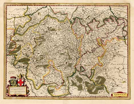 "Trevirensis archiepiscopatus, et Lutzenburgi ducatus"Karte von Luxemburg mit dem Erzbistum Trier. Altkol. Kst., Amsterdam ca. 1630,38 x 50 cm. Schönes, breitrandiges Exemplar.