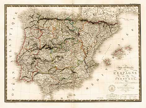 "Carte Général de l' Espagne en du Portugal"Map of the Iberian Peninsulal. Copper engraving, orig. outline colour, Paris 1821(d), 40,5 x 55 cm. Nice item with broad margins.