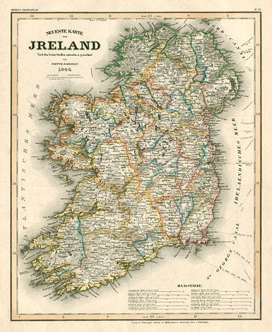Karte von Irland mit 12 verschiedenen Maßstabsangaben.