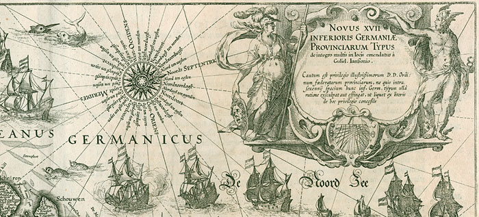 ist mit zahlreichen Segelschiffen und Seeungeheuern