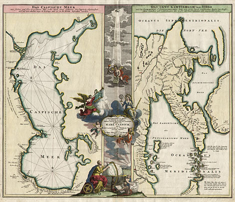 der Kaspischen Meeres, rechts Karte von Kamtschatka