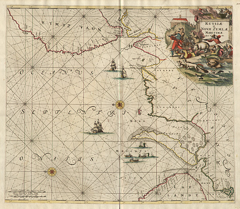 Novaya Zemlya, dekorative Titelkartusche mit Jagdszenen