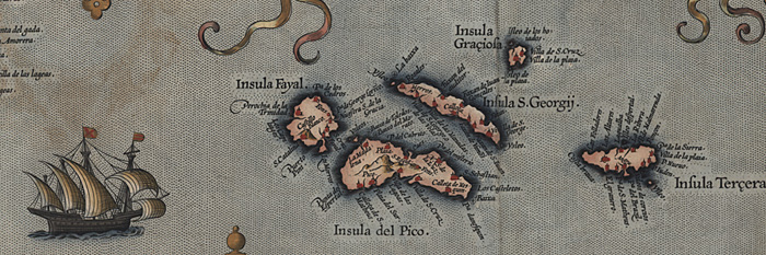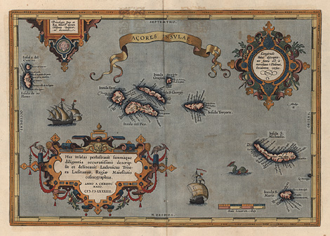 Karte der Azoren, mit 3 dekorativen Kartuschen.