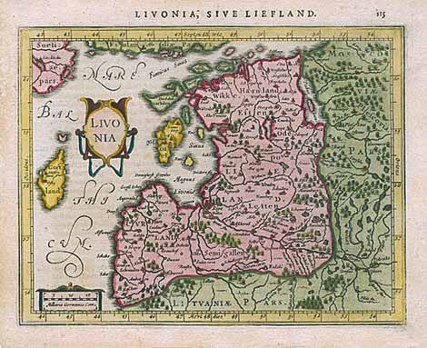 "Livonia"Karte von Livonien, dem Gebiet von Lettland und Estland, aus einem kleinen 'Mercatoratlas',kol. Kst., Amsterdam ca. 1620, 14,5 x 19 cm.