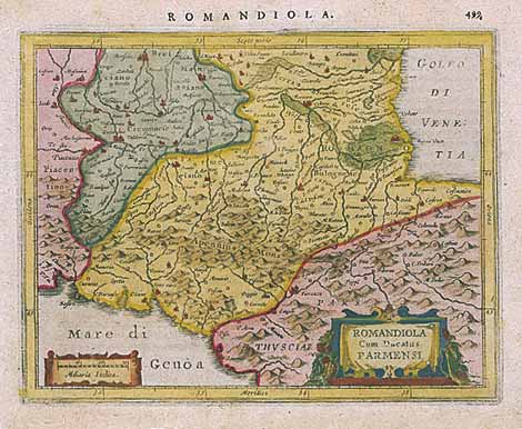 "Romandiola cum ducatus Parmensi"Karte der Emilia-Romagna,aus einem kleinen 'Mercatoratlas',kol. Kst., Amsterdam ca. 1620, 15 x 19 cm.