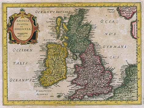 "Anglia, Scotia et Hibernia"Map of Great Britain,from a Mercator's small atlas,without text.Col. copper engraving,Amsterdam 1686,19 x 25,5 cm.Paper somewhat toned overall.